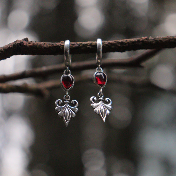 Resting one elegant huggie hoops these deep red garnet teardrops drip like a sacred offerings of light and shadow. Their rich crimson glow catches the heart instantly, drawing the gaze down to a delicate fleur-de-lis—a timeless emblem of devotion, power, and divine beauty.