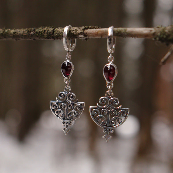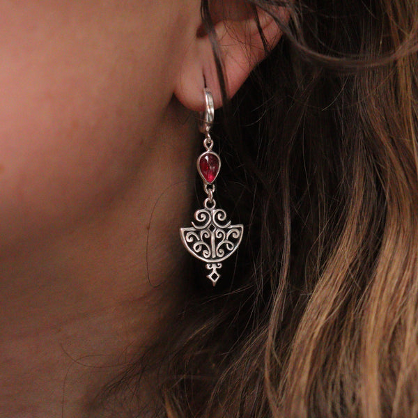 Suspended from graceful lever backs, each deep red teardrop gleams beneath an ornate silver charm, richly detailed and worthy of nobility. They shimmer with the intensity of secrets never spoken, passion never tamed, and loyalty paid in blood and beauty.